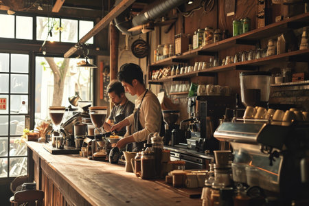 Coffee Brewing and Barista Techniques. Two baristas skillfully preparing coffee using specialty tools and techniques.