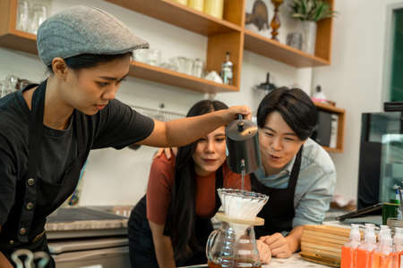 Young Asian people who dream of having a coffee shop is practicing to make coffee in a vocational training school.