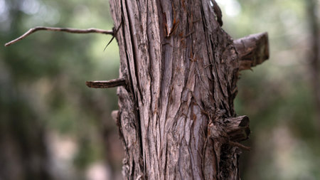 Close up of the trunk and branches of a pine tree that are no longer intact in some parts with a bokeh background.