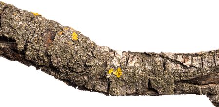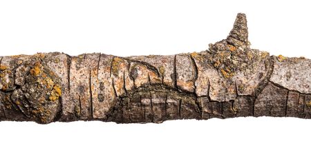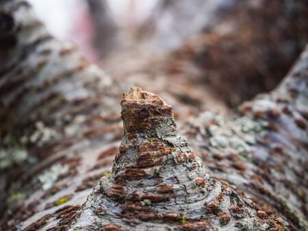 Closeup cracked tree branch. Gnarled bark covered with gray lichen.