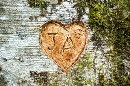 Word Ja in a heart carved in the bark of a tree in the forest.