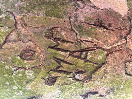 Textured surface of tree bark reveals rich colors and intricate patterns under natural light.