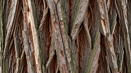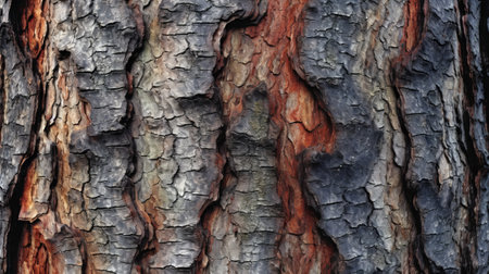 Textured surface of tree bark reveals rich colors and intricate patterns under natural light.