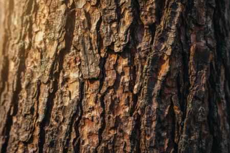 Close up view of an ancient trees bark reveals deep grooves and unique natural patterns. This macro shot showcases the rugged texture and rich details created over time in a forested area.