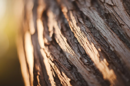 Close up of rough and weathered tree bark in warm sunlight.