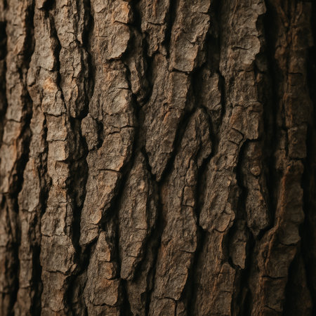 Macro shot of tree bark texture with deep grooves and rich earthy tones, displaying the raw details of nature.