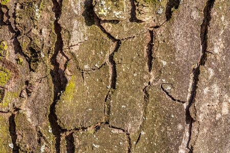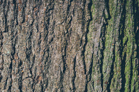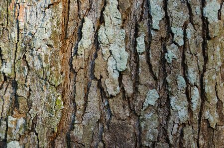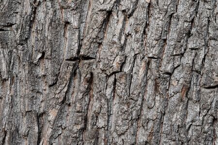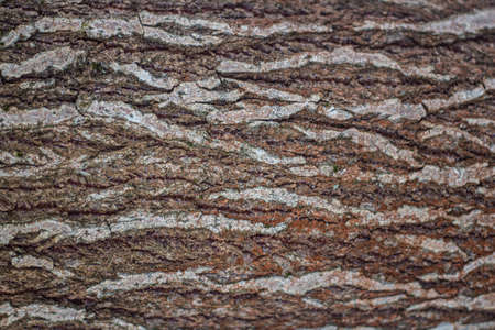 Closeup macro detail of old aged beautiful oak maple tree bark barque. Natural wooden textured abstract tree background unusual pattern shape with cracks, checks, holes and curvy lines.