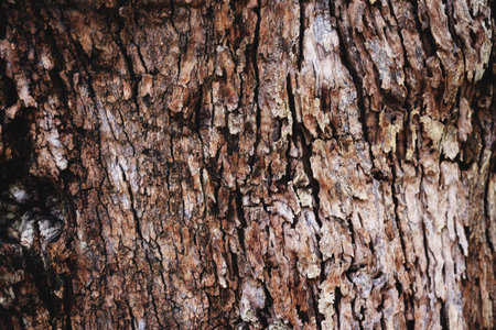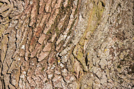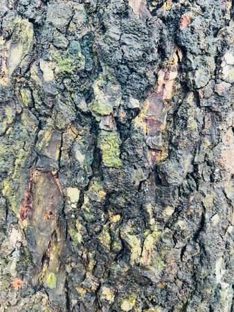 Textured surface of tree bark reveals rich colors and intricate patterns under natural light.