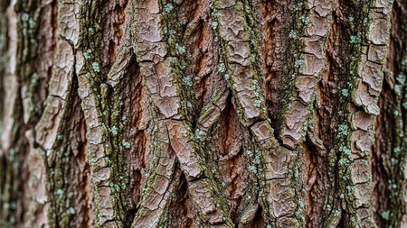 Detailed close up of textured tree bark with rough ridges, deep fissures, and earth tone variations. Moss accents the barks natural patterns.