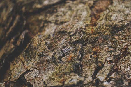 Rough and dry. Tree trunk. Tree bark texture. Tree stem cover closeup. Mature tree covered with moss. Woody plant. Forest nature. Natural background.
