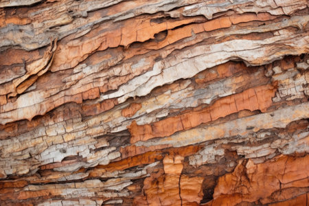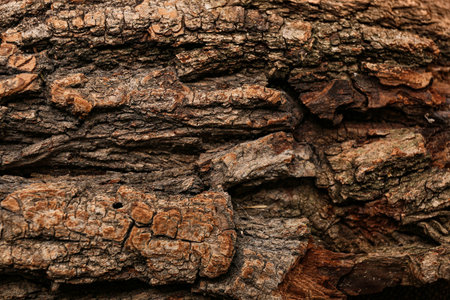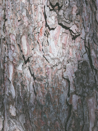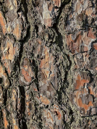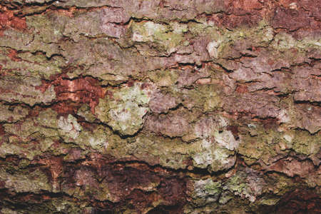 Textured surface of tree bark reveals rich colors and intricate patterns under natural light.