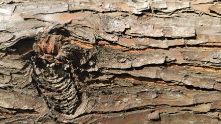 Texture of old pine close-up. Incredibly beautiful pattern. Bullet from rifle struck tree. Tree is damaged. Negative influence of man on nature. Macro photography.
