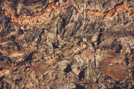 Closeup photo of an old tree trunk with cracked bark on it, abstract natural background, autumn season..