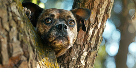 Portrait of a cute dog on a tree in the park.