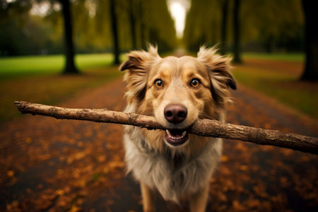 dog stick mouth park. animal field. Generate AI