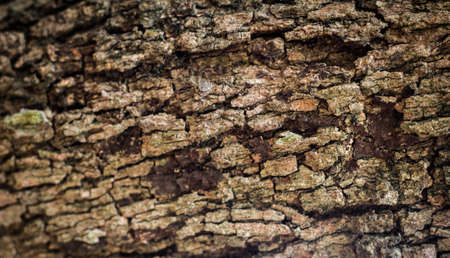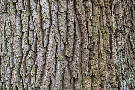 Closeup macro detail of old aged beautiful oak maple tree bark barque. Natural wooden textured abstract tree background unusual pattern shape with cracks, checks, holes and curvy lines.