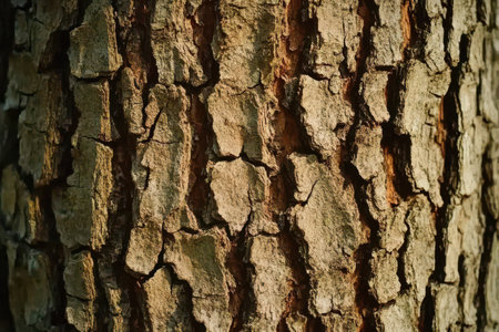 Textured tree bark reveals intricate patterns and fissures, highlighting nature's artistry. This close-up captures the warm tones of the wood in a serene forest environment.