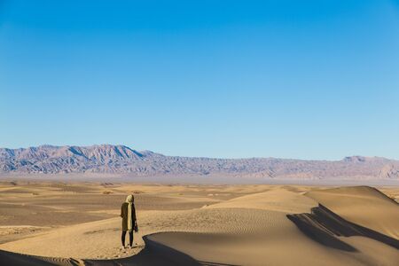 women sihouette with long scarf during sunset in Bafgh desert in Yazd, Iran