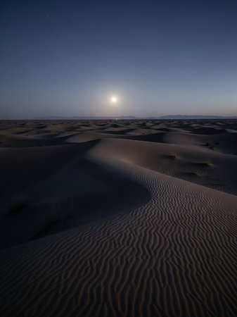 A full moon illuminates vast desert sand dunes with rippled textures under a clear night sky, creating a serene and atmospheric landscape.