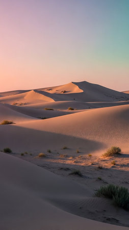 Softly lit sand dunes exhibit gentle curves and ripple patterns under a pastel sky, with a few hardy green plants dotting the arid landscape.