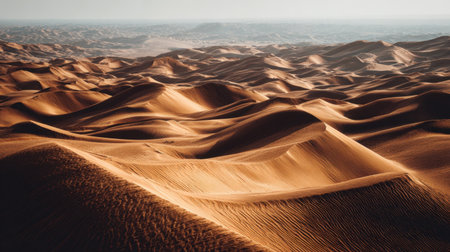A stunning view of expansive golden sand dunes, beautifully lit by soft ambient light. This serene desert landscape captures the tranquility and majesty of nature.