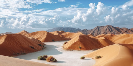 Vast Desert Landscape with Rolling Sand Dunes Under a Bright Blue Sky and Majestic Mountain Range