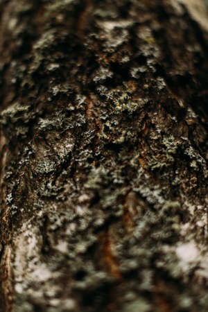Rough and dry. Tree trunk. Tree bark texture. Tree stem cover closeup. Mature tree covered with moss. Woody plant. Forest nature. Natural background.