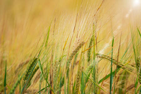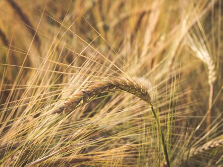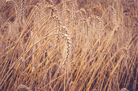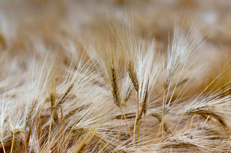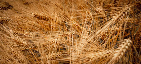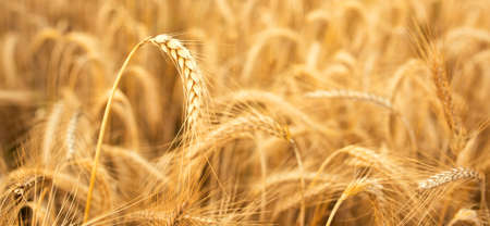 organic golden ripe ears of wheat in field, soft focus, closeup, agriculture background