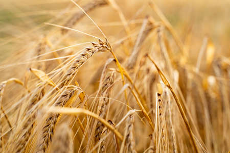 Ripe harvest ready wheat crops field in summer, cereal plant cultivation, selective focus