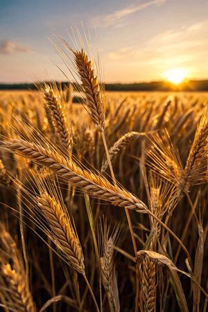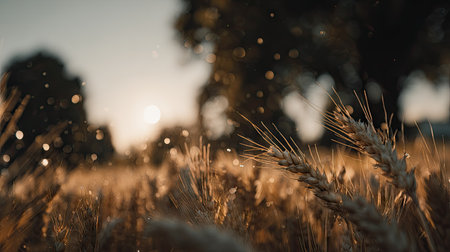 A close-up view of ripe wheat stalks in a field bathed in the warm, golden light of sunset. The sun's rays illuminate the golden-yellow and orange hues of the grain, highlighting the intricate details of the stalks and seeds. The background is softly blurred with bokeh, creating a dreamy and serene atmosphere. The emphasizes the texture and natural beauty of the wheat, conveying a sense of abundance and the peacefulness of a rural harvest.