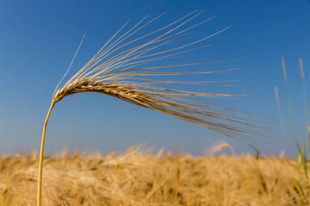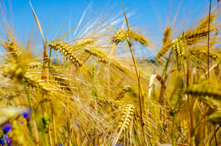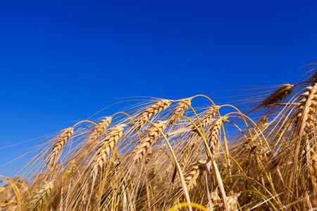 Ripe wheat spikes on the wheat field against blue sky argicultural background, wheat harvest in late summer