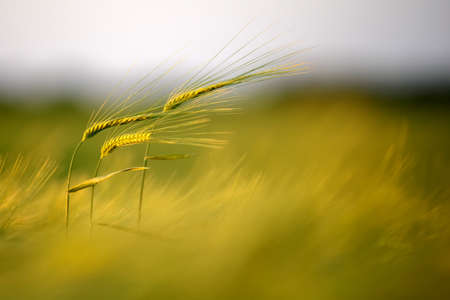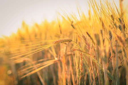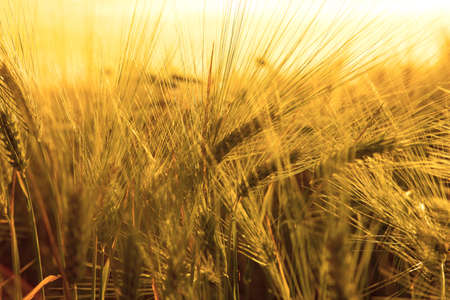 Close up macro shot of golden field of barley crops growing on farm at sunset or sunrise