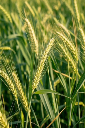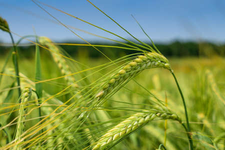 Unripe green wheat ears in cultivated plantation field, selective focus