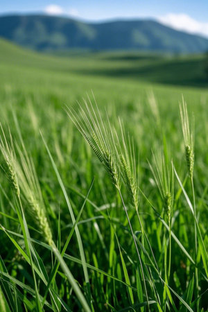 Bright green field fluffy spikelets, Closeup of green grass, Spikelets still green wheat in a field on a sunny day.