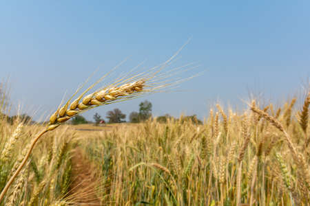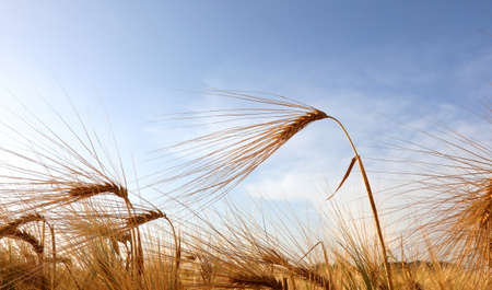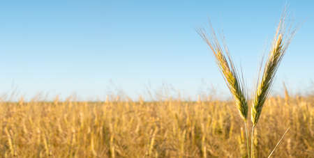 Golden wheat spikelets on field ripe crop before harvesting on summer day on blue sky background