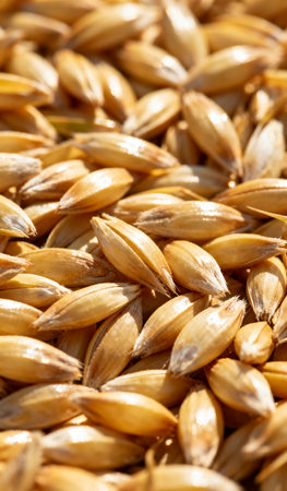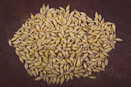 Dry barley grain brown malt ingredient in cooking and beverage production. Process of making craft beer from malt. Concept of alcoholic beverage homemade.