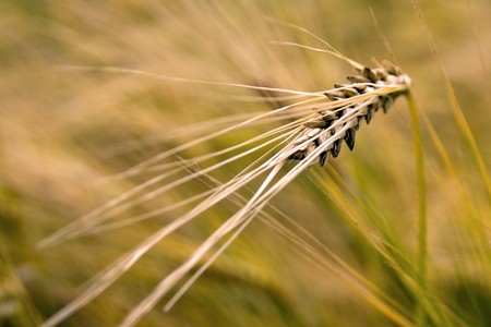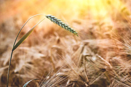 Ear of wheat, wheat field in late afternoon, beautifil landscape in evening, in dusk