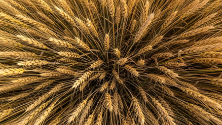 A top-down view captures the intricate texture of ripe, golden wheat ears radiating from the center. The sharp details of the grain stalks create a chaotic yet natural pattern, symbolizing a ready harvest.