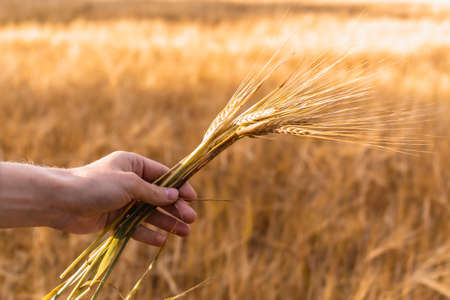 Wheat field at sunset. Golden ears of wheat. The concept of harvest.