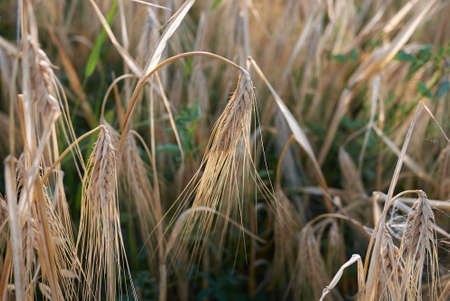 Barley (Hordeum vulgare) growing on filed, closeup of barley with ears bowed almost ready for harvesting.