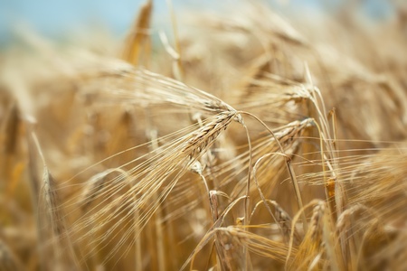 golden ear of wheat against the blue sky soft focus, closeup, agriculture background