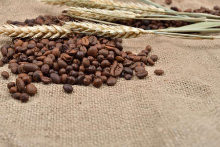 Roasted coffee beans on brown jute background, with several threads of wheat on it. Rustic image. Morning pleasure. Still life. Selective focus. Copy space