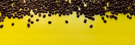 Roasted coffee beans background texture, isolated on yellow background with copy space for text, close up