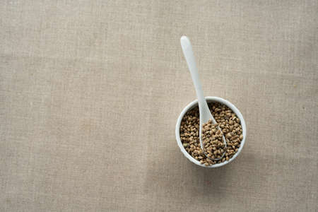 A white ceramic bowl full of hemp seeds over linen background