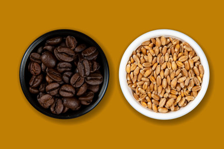 bowls with culinary ingredients coffee bean, wheat seed on colour background