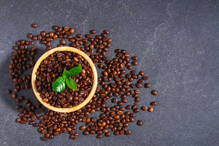 Roasted coffee beans background on a stone table. Horizontally.