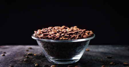 Roasted Coffee beans closeup in a glass bowl on a black background
