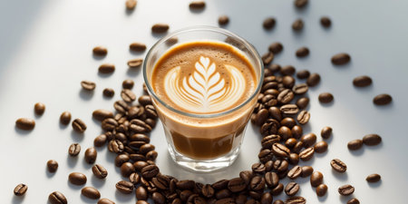 AI Generated. Aromatic Latte Art Coffee Drink in Glass Surrounded by Coffee Beans