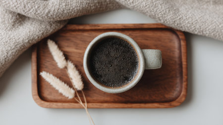 A cozy ceramic coffee mug rests on a sleek wooden tray, accompanied by delicate dried flowers and a soft blanket, creating a warm, inviting atmosphere for relaxation.
