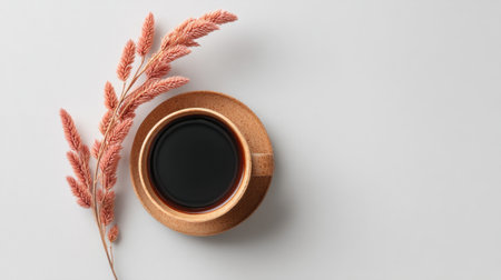 A serene flatlay featuring a rustic coffee cup on a saucer, complemented by a pampas grass stem. Perfect for evoking warmth and simplicity in home decor.